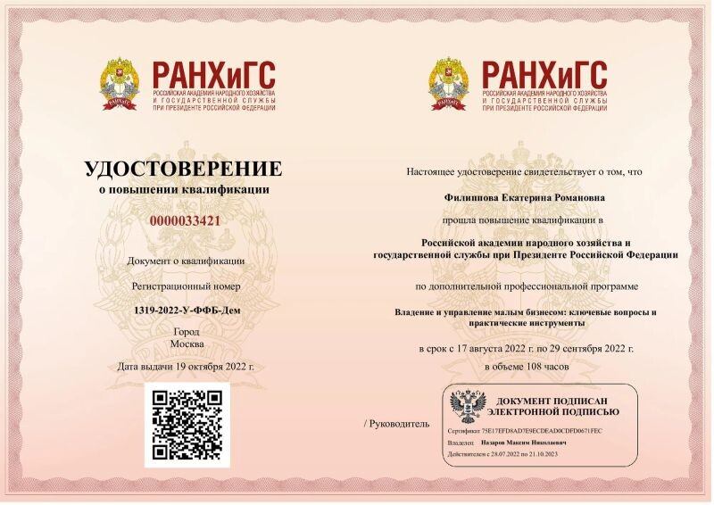 - РАНХиГС, программа «Владение и управление малым и средним бизнесом: ключевые вопросы и практические инструменты», 2022 г.