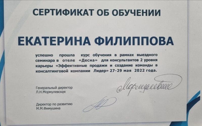 - Отель «Десна», курс для консультантов 2 уровня карьеры «Эффективные продажи и создание команды в консалтинговой компании "Лидер"», 2022 г.