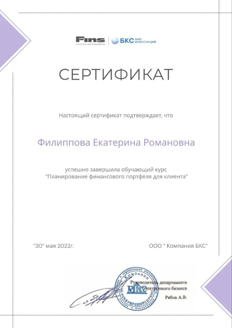 - ООО «Компания БКС», курс «Планирование финансового портфеля для клиента», 2022 г.