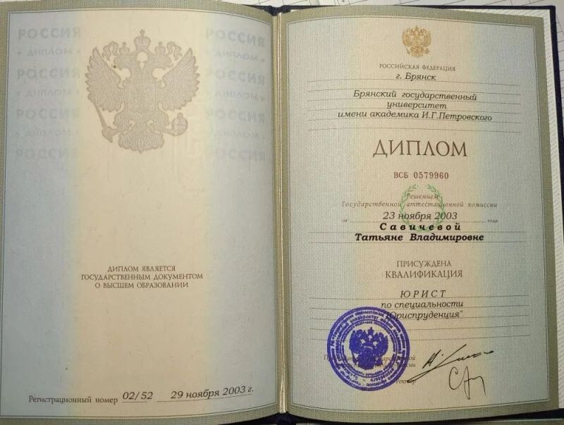 - Брянский государственный университет имени академика И.Г.Петровского, юрист, юриспруденция, специализация гражданско-правовая, 2000–2003 гг.