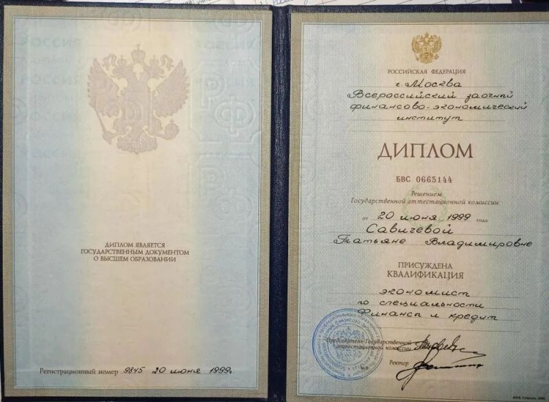 - Всероссийский заочный финансово-экономический институт, факультет – финансы и кредит, специализация кредит, г. Москва, 1994–1999 гг.