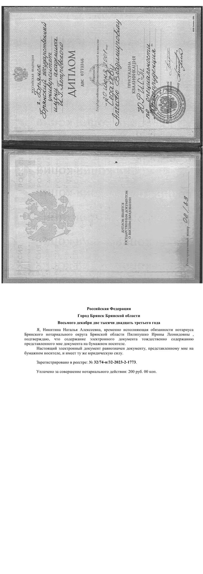 - Брянский государственный университет имени академика И.Г. Петровского, юрист, 1996–2001 гг.
