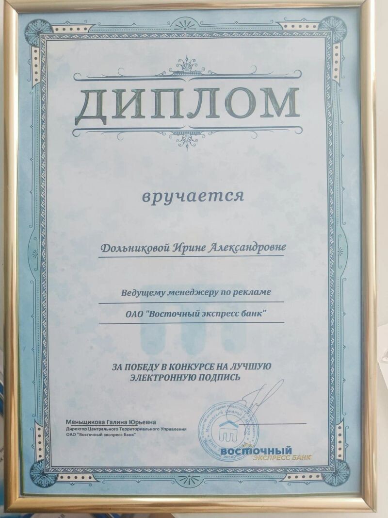 - ПАО КБ "Восточный" Диплом за победу в конкурсе на лучшую электронную подпись (с 2014 г.).