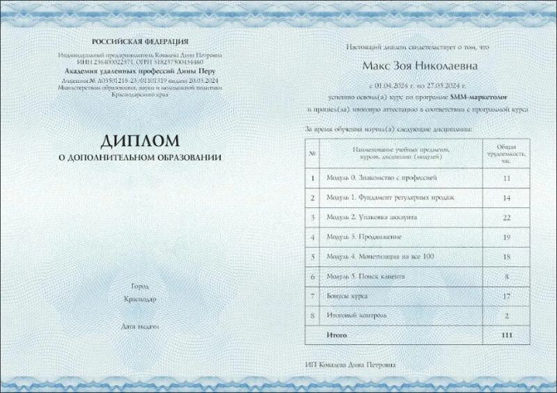 - Прошла обучение в Академии удалённых профессий Дины Перу. Получила диплом государственного образца по профессии СММ-маркетолог (с 2024 г.).