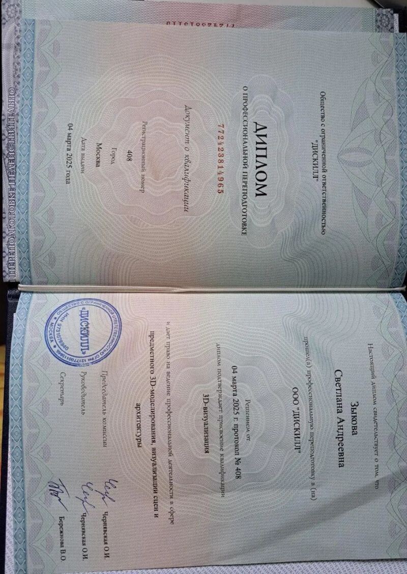 - Дискилл, профессиональная переподготовка «3D-визуализация», 2023–2025 гг.