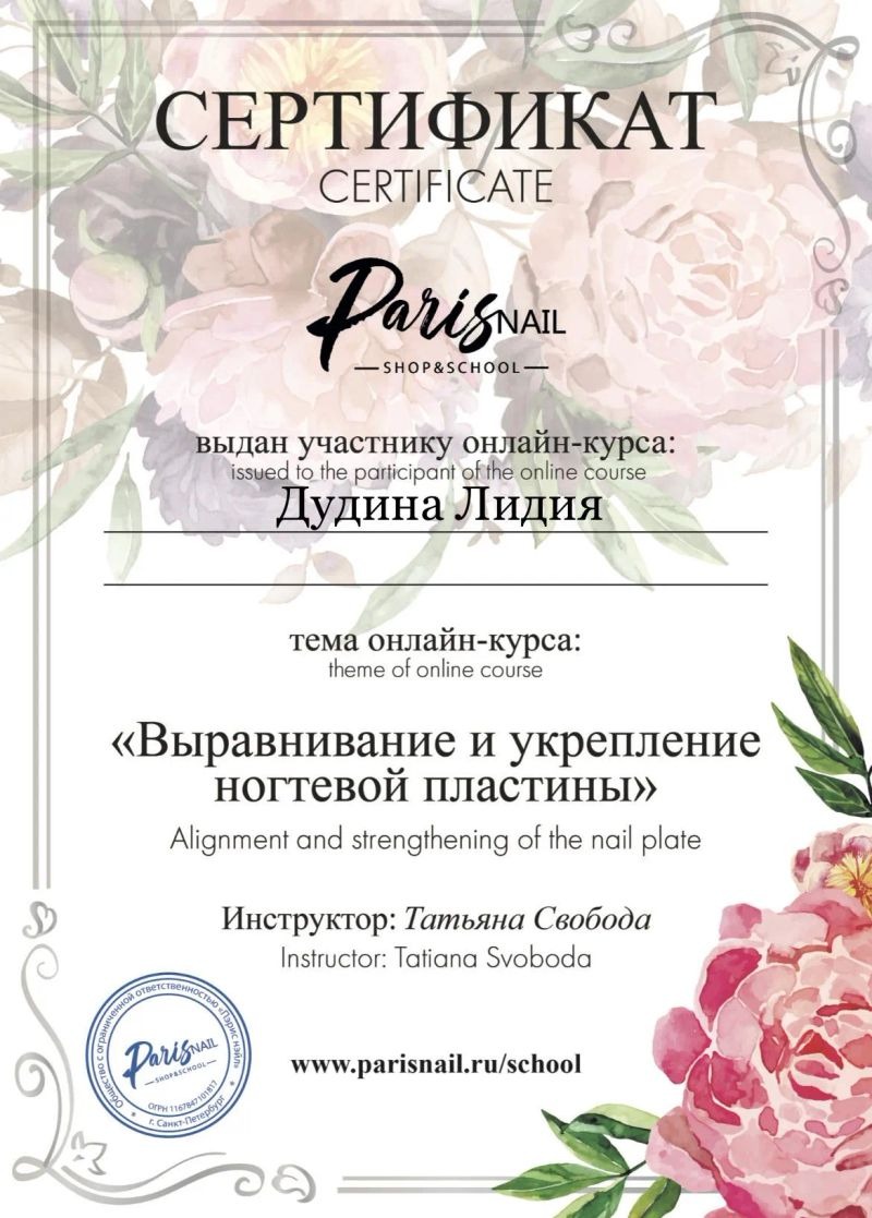 - ParisNail, онлайн-курс «Выравнивание и укрепление ногтевой пластины», 2024 г.