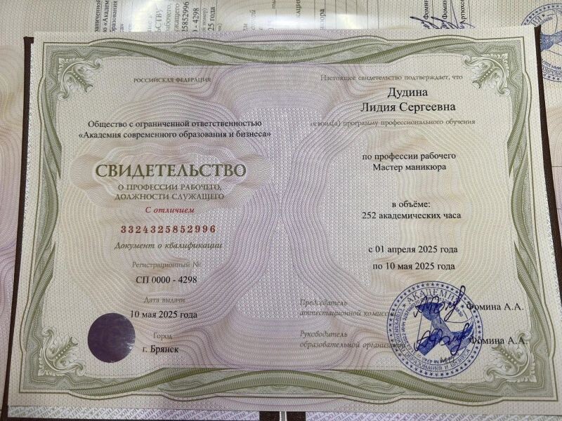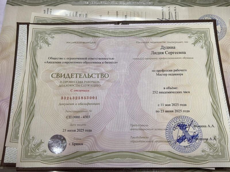 - ООО «Академия современного образования и бизнеса», мастер педикюра, 2025 г.
