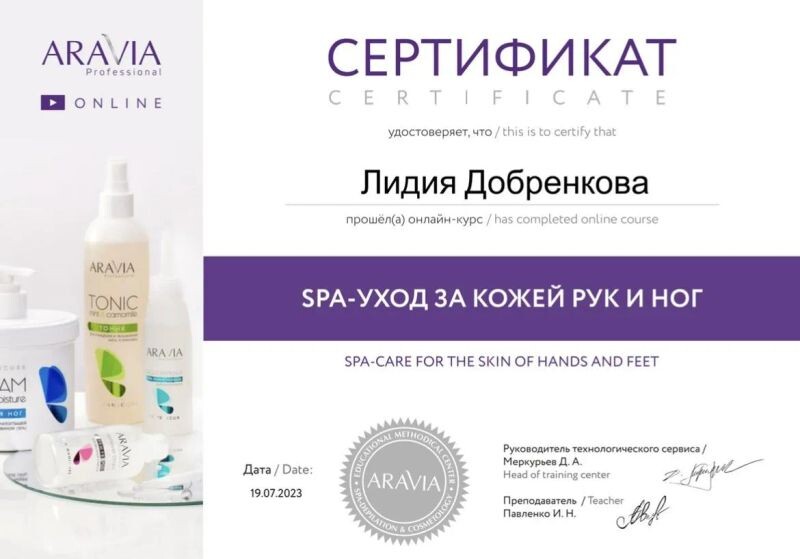 - Аravia, онлайн-курс «Spa-уход за кожей рук и ног», 2023 г.