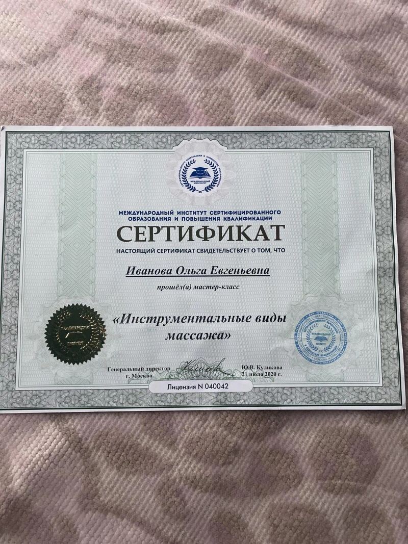 - Международный институт сертифицированного образования и повышения квалификации, мастер-класс «Инструментальные виды массажа», 2020 г.