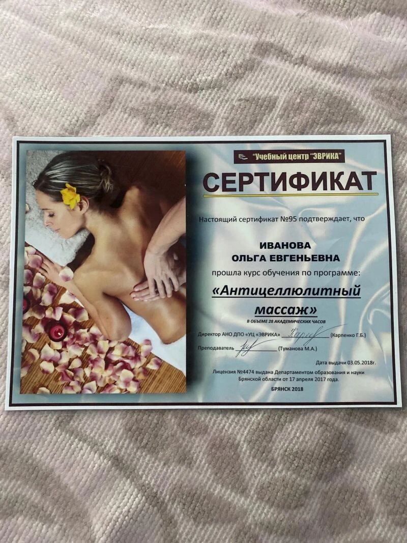 - Учебный центр «Эврика», программа «Антицеллюлитный массаж», 2018 г.