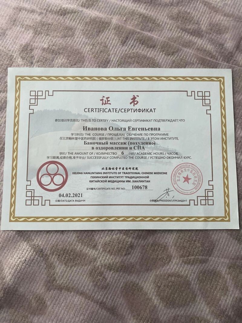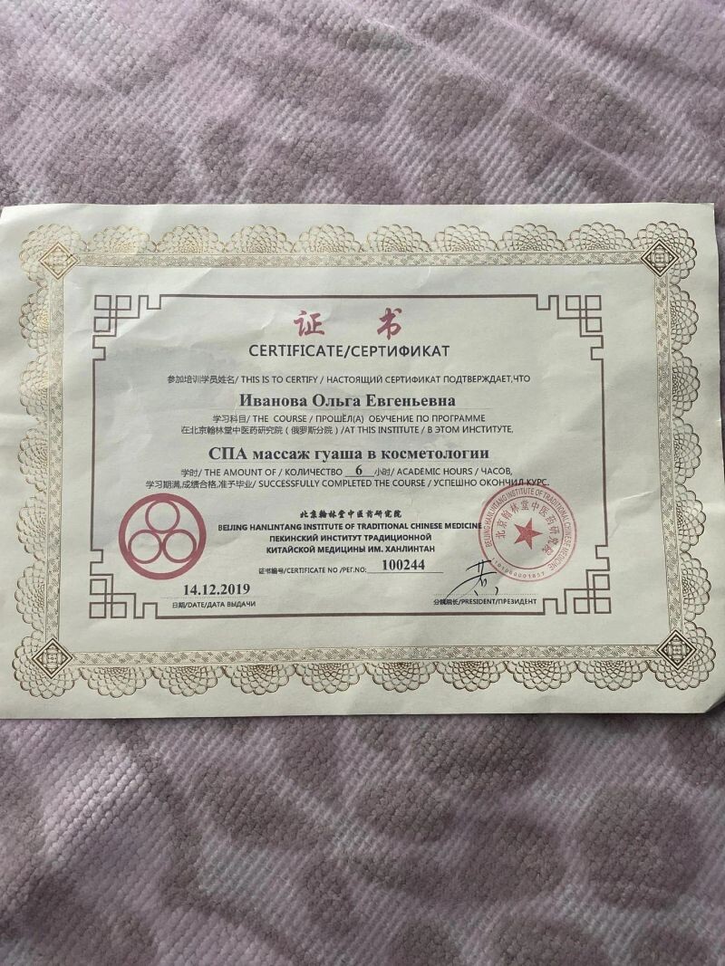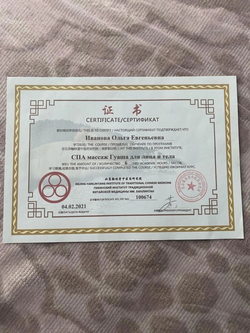 - Пекинский институт китайской медицины им. Ханлинтан, программа «СПА массаж гуаша для лица и тела», 2021 г.