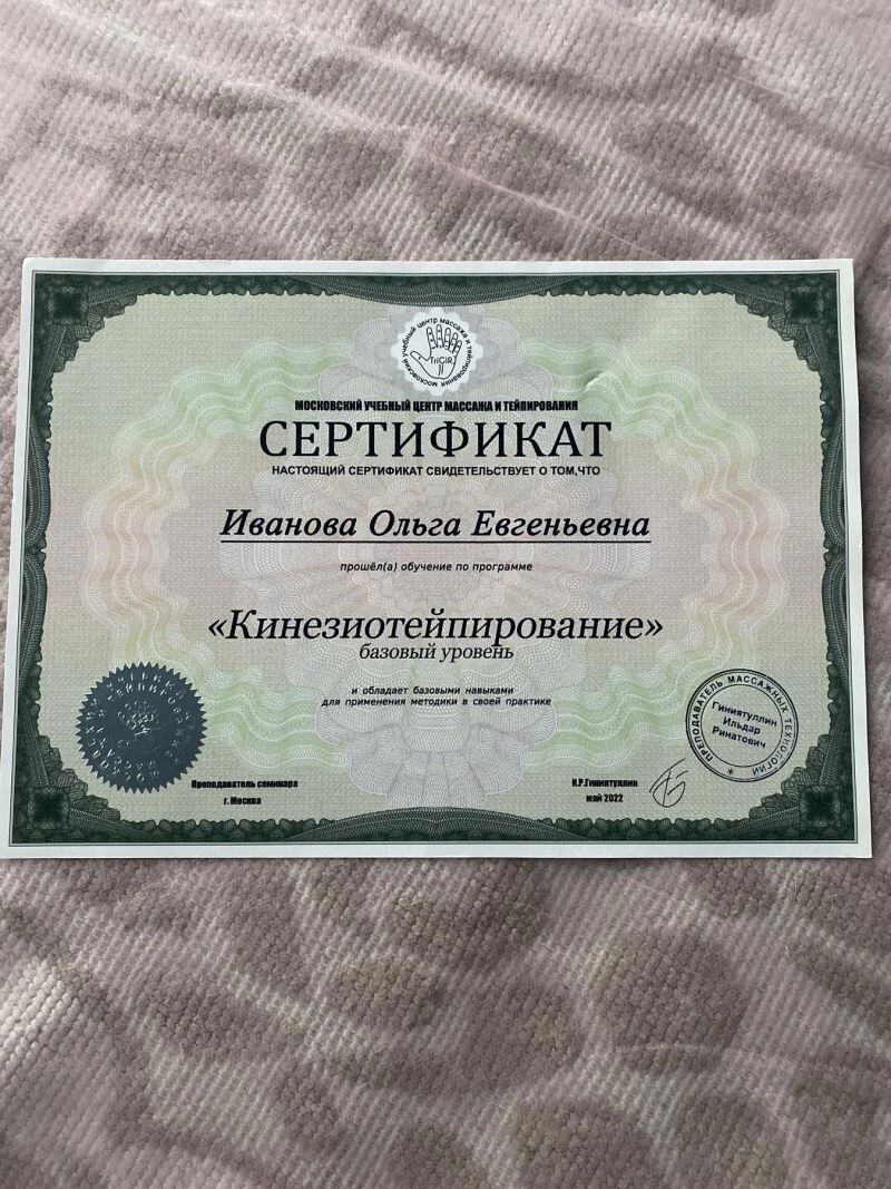 - Московский учебный центр массажа и тейпирования, программа «Кинезиотейпирование», 2022 г.