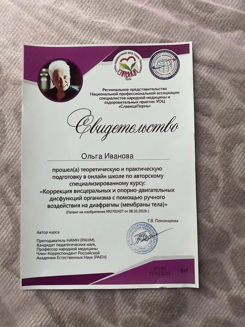 - УОЦ «Славица Пермь», курс «Коррекция висцеральных и опорно-двигательных дисфункций организма», 2023 г.