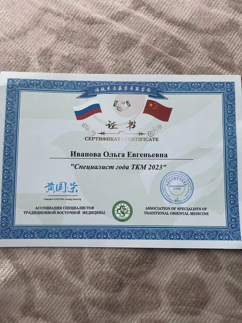 - Ассоциация специалистов традиционной восточной медицины, специалист года ТКМ, 2023 г.