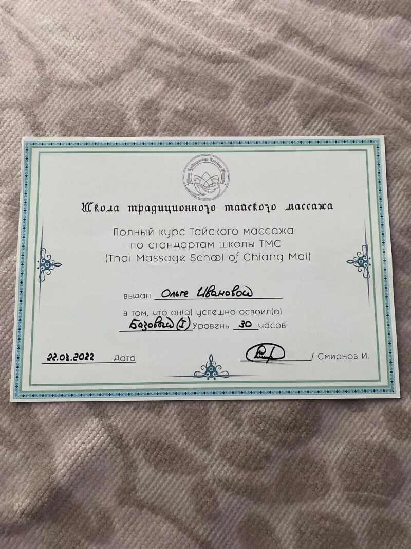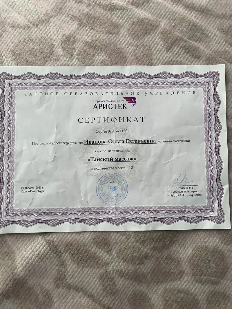- Образовательный центр «Аристек», курс «Тайский массаж», 2021 г.