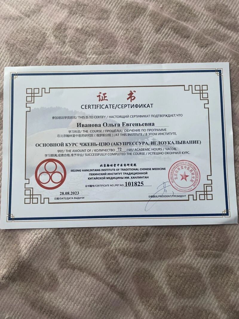 - Пекинский институт китайской медицины им. Ханлинтан, программа «Основной курс Чжень-Цзю», 2023 г.