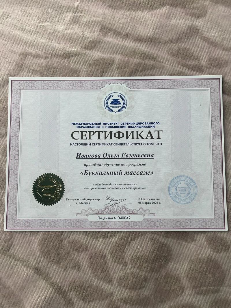 - Международный институт сертифицированного образования и повышения квалификации, программа «Буккальный массаж», 2020 г.