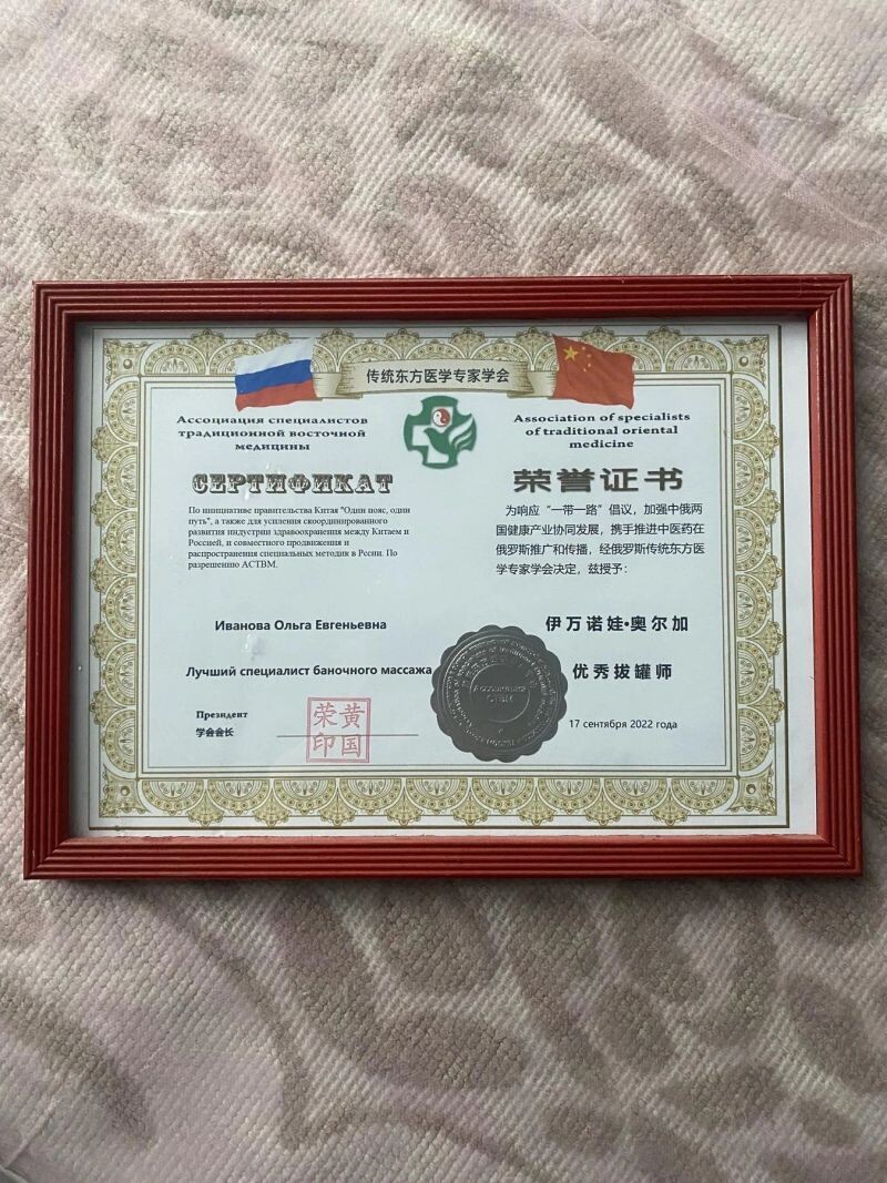 - Ассоциация специалистов традиционной восточной медицины, специалист баночного массажа, 2022 г.