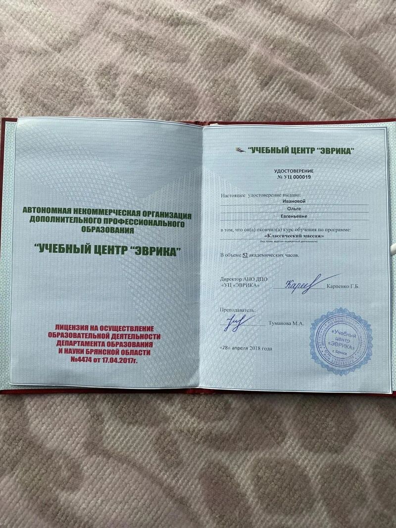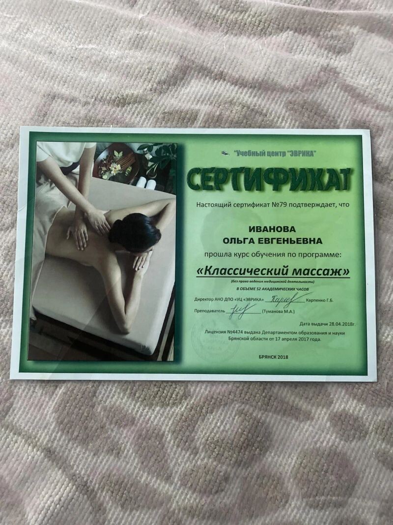 - Учебный центр «Эврика», программа «Классический массаж», 2018 г.