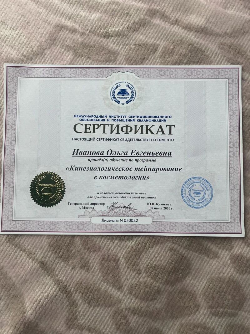 - Международный институт сертифицированного образования и повышения квалификации, программа «Кинезиологическое тейпирование в косметологии», 2020 г.
