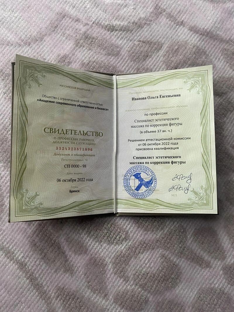 - Академия современного образования и бизнеса, квалификация «специалист эстетического массажа и коррекции фигуры», 2022 г.
