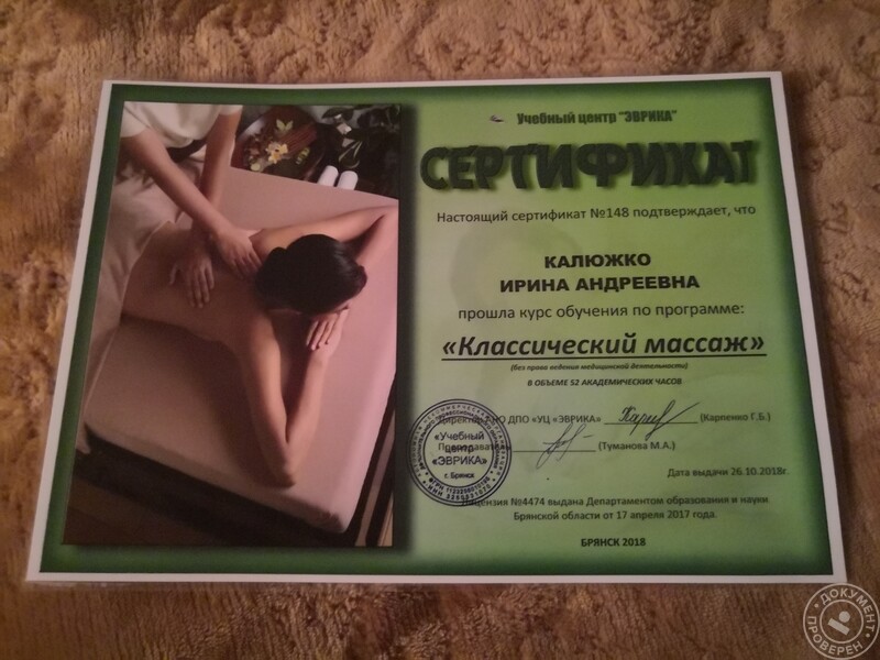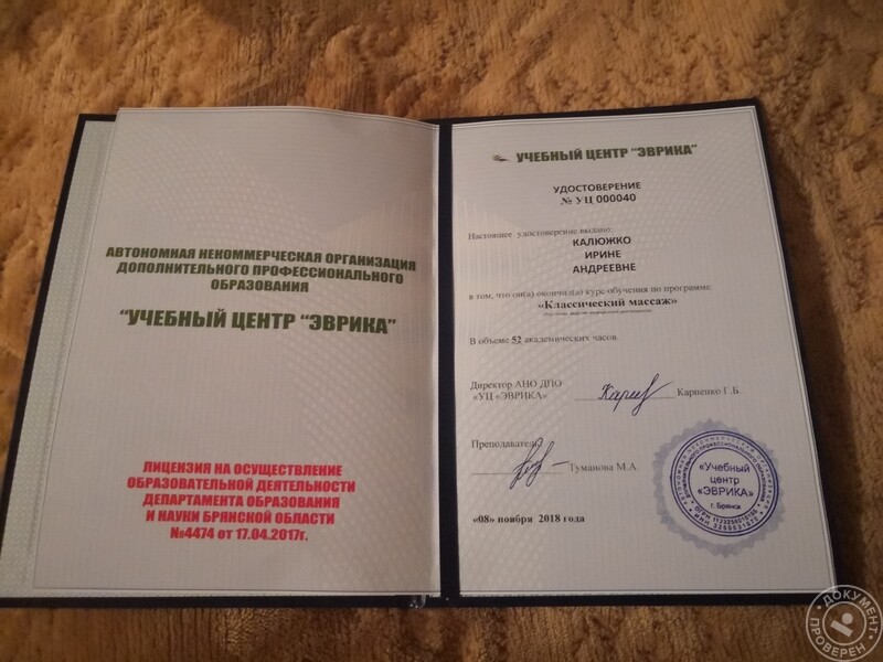 - Учебный центр «Эврика», курс «Классический массаж», 2018 г.