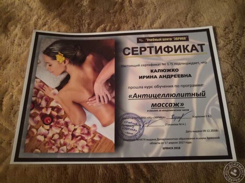 - Учебный центр «Эврика», курс «Антицеллюлитный массаж», 2018 г.