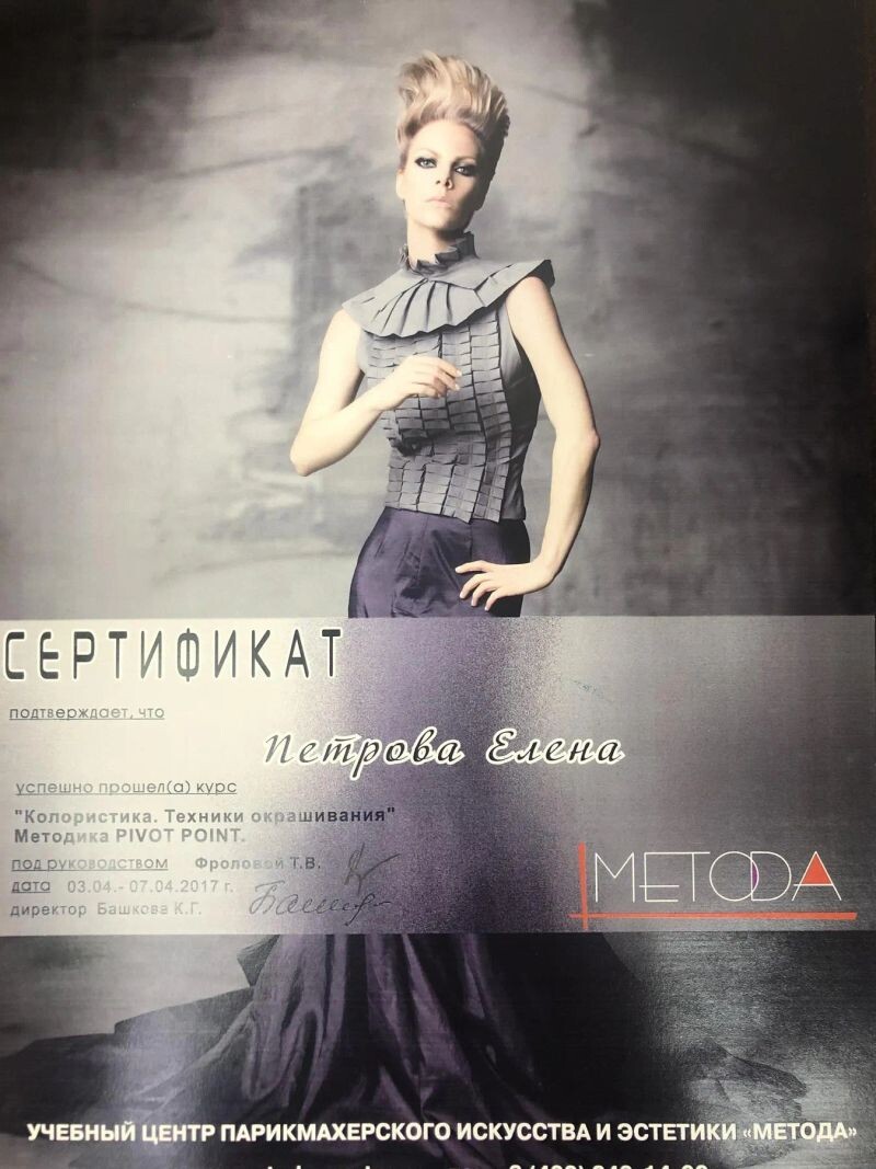 - Академия парикмахерского искусства Metoda, курс «Колористика. Техники окрашивания. Методика PIVOT POINT», 2017 г.