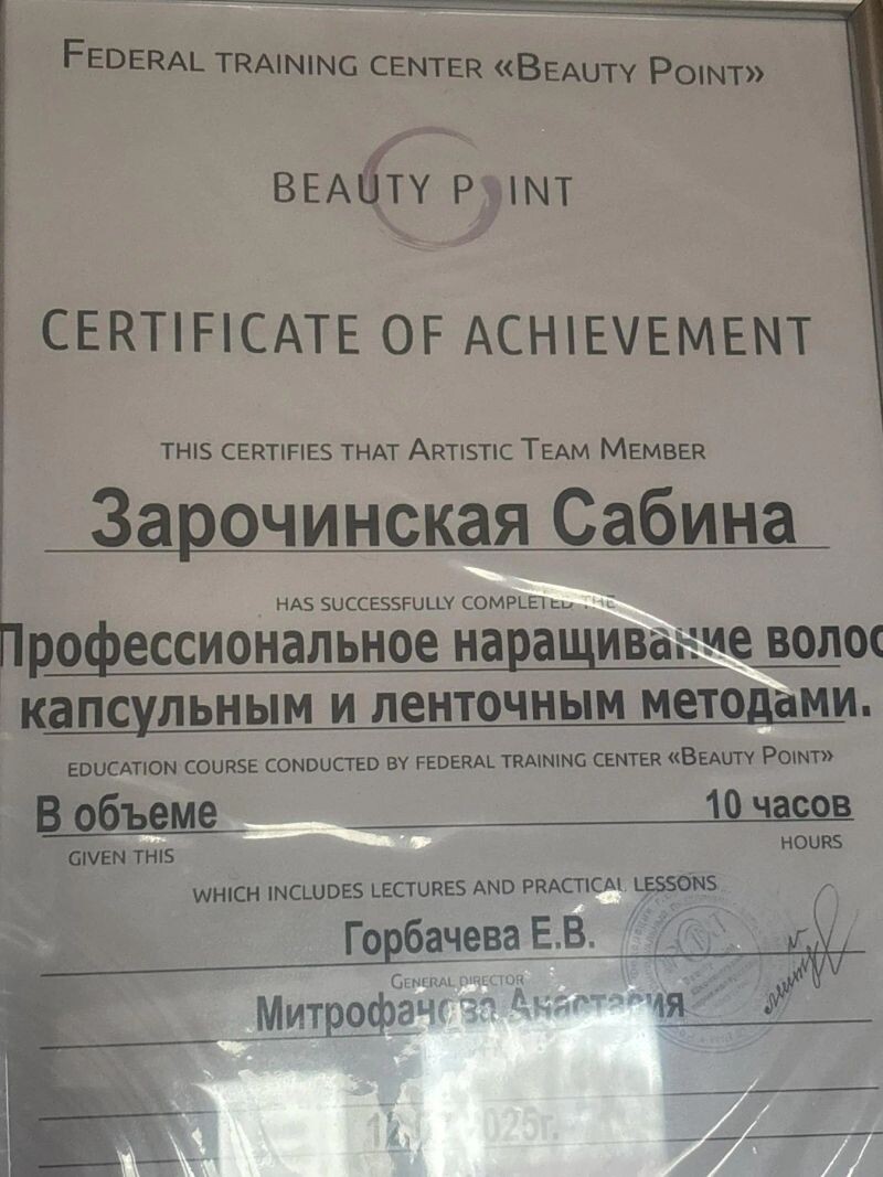 - Школа парикмахерского искусства Бьюти Поинт « Профессиональное наращивание волос капсульным и ленточным методами», 2024–2025 гг.