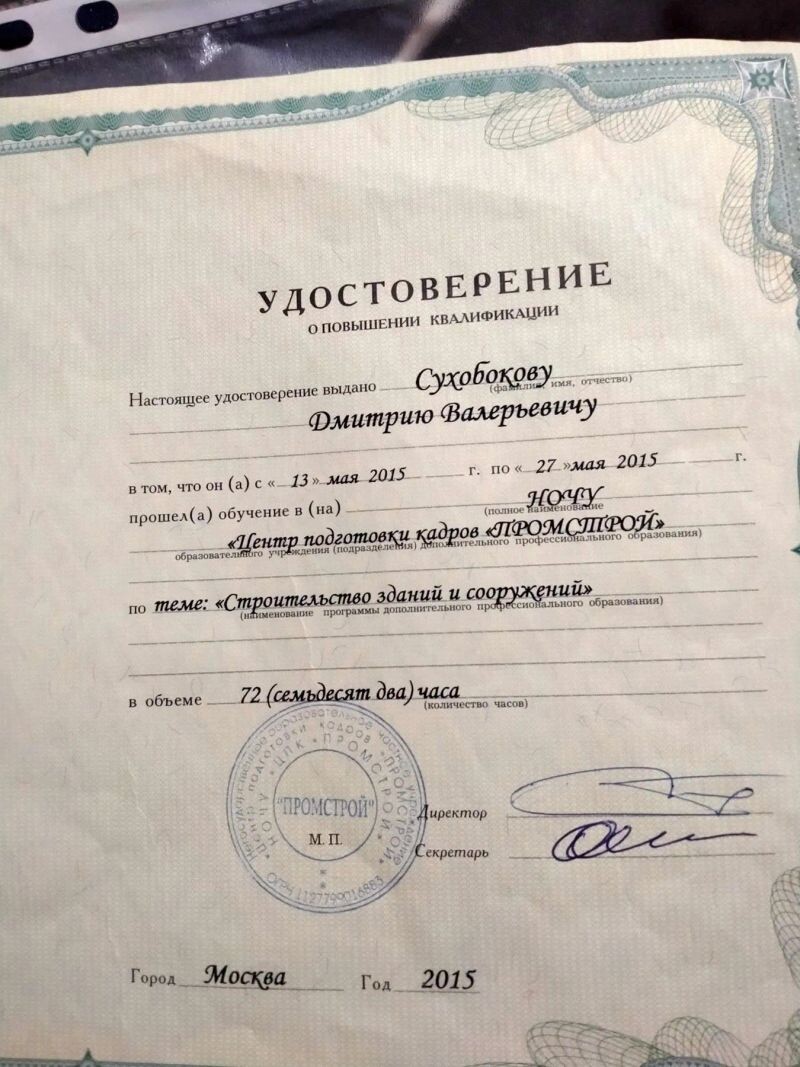 - НОЧУ «Центр подготовки кадров "Промстрой"», удостоверение о повышении квалификации по теме «Строительство зданий и сооружений», 2015 г.