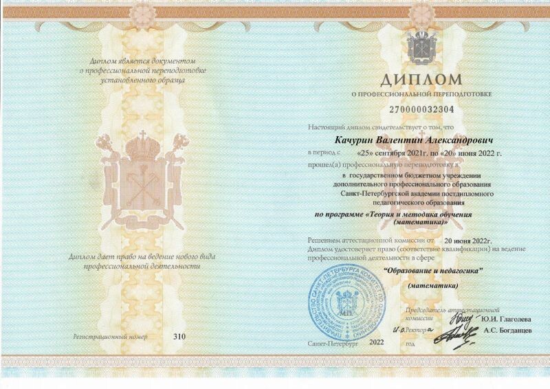 - Диплом о профессиональной переподготовке по программе «Теория и методике обучения» — «Математика», 2021–2022 гг.