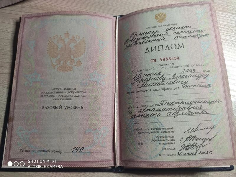 - Новозыбковский сельскохозяйственный техникум, техник- электрик, электрификация и автоматизация сельского хозяйства, 2000–2003 гг.