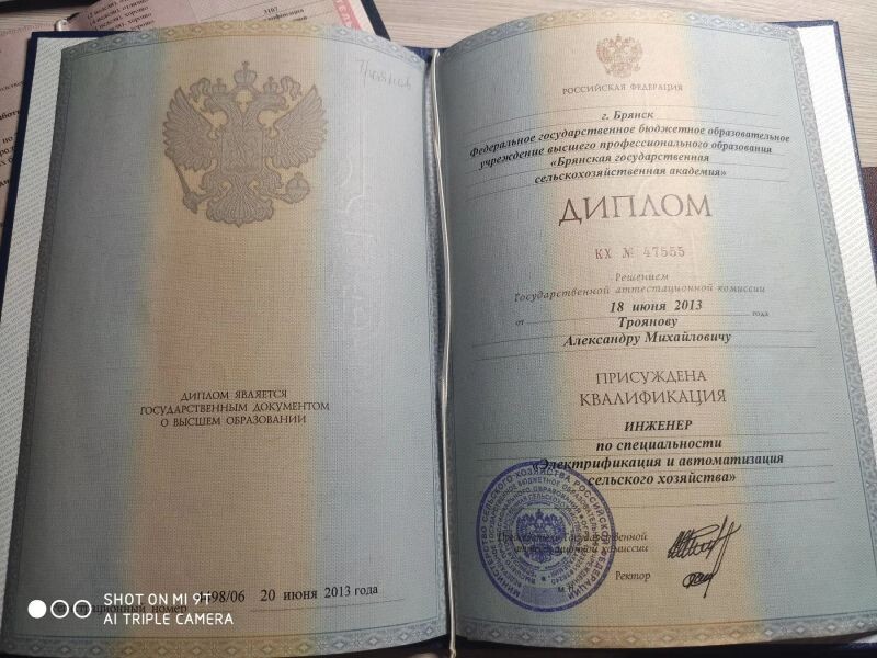 - Брянская государственная сельскохозяйственная академия, инженер - электрик, электрификация и автоматизация сельского хозяйства, 2006–2013 гг.