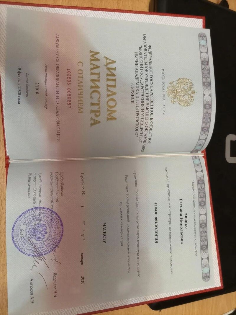 - Брянский государственный университет имени академика И.Г. Петровского, филологический факультет, филология, 2017–2020 гг.
