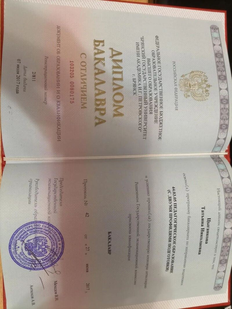 - Брянский государственный университет имени академика И.Г. Петровского, филологический факультет, педагогическое образование (с двумя профилями подготовки), 2012–2017 гг.