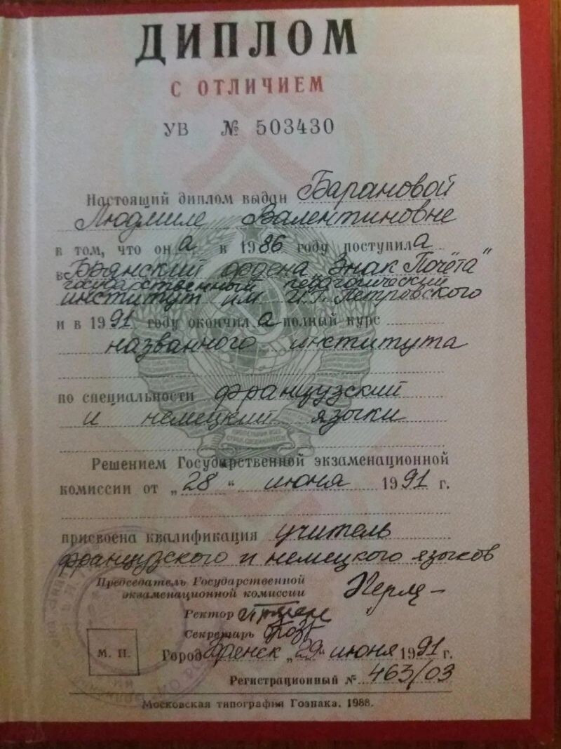 - Брянский государственный педагогический институт им. И. Г., специальность «французский и немецкий языки», 1986–1991 гг.