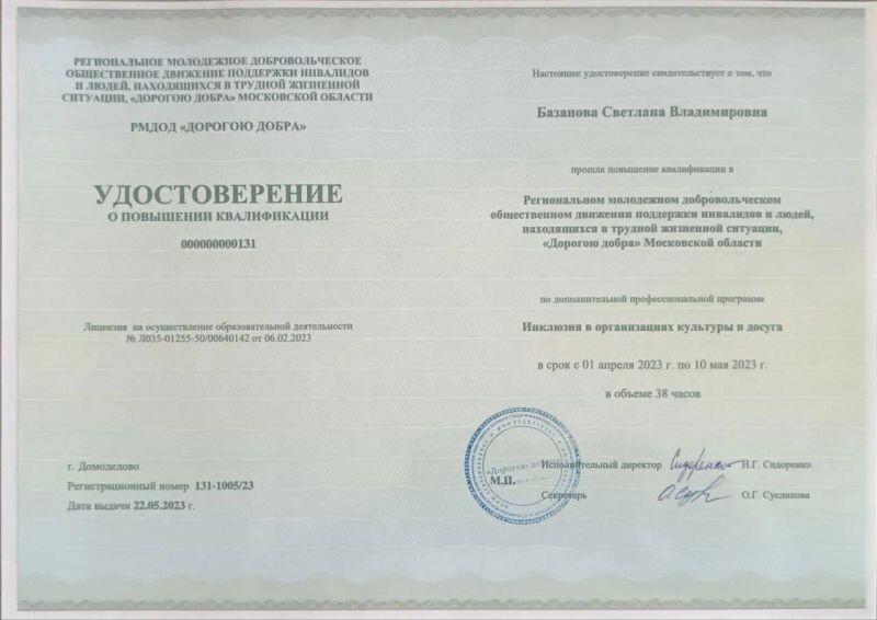 - РМДОД «Дорогою добра», программа «Инклюзия в организациях культуры и досуга», 2023 г.