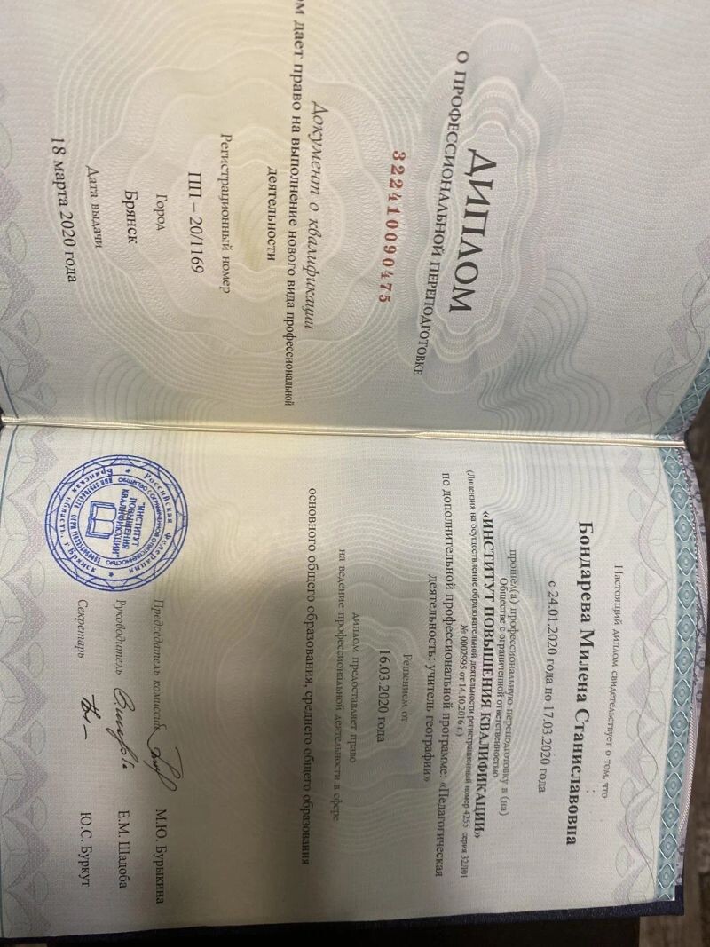 - Институт повышения квалификации, программа «Педагогическая деятельность: учитель географии», 2020 г.