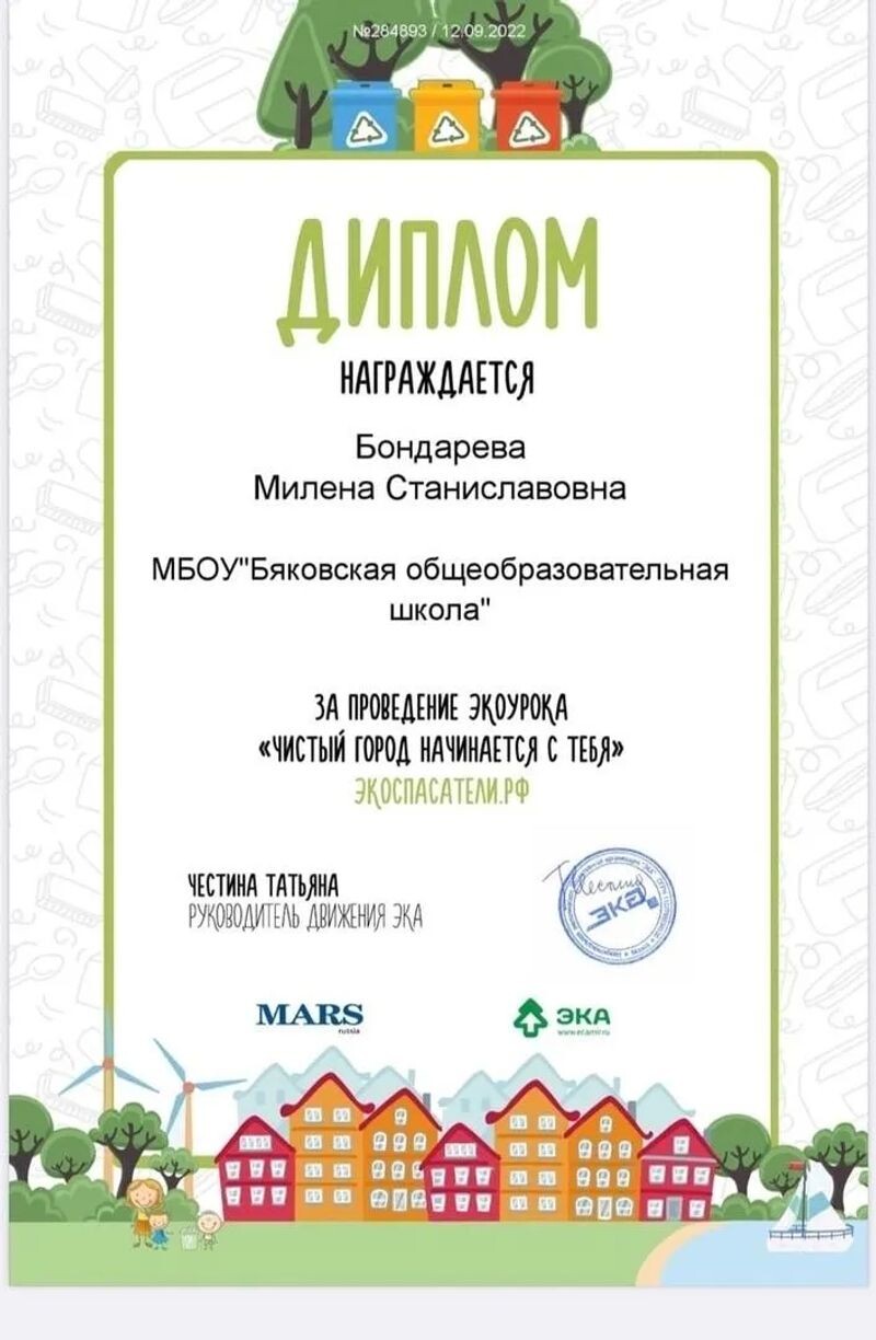 - Движение «ЭКА», диплом за проведение экоурока «Чистый город начинается с тебя», 2024 г.