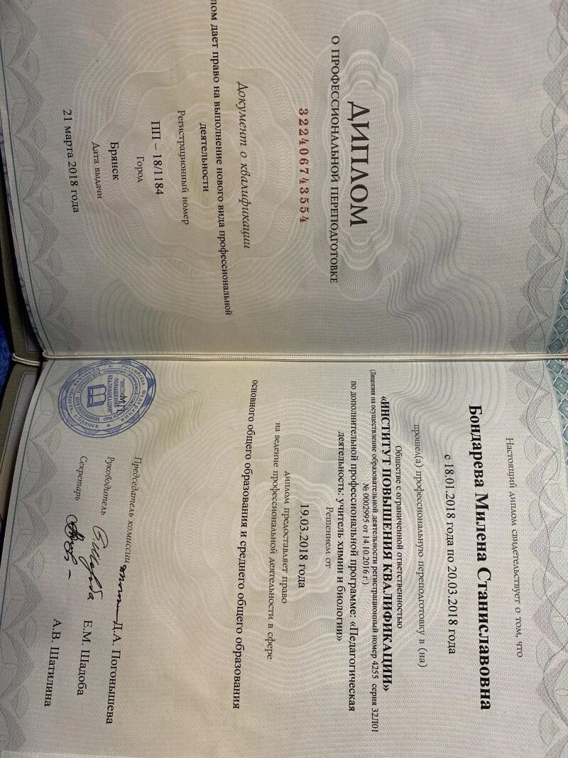 - Институт повышения квалификации, программа «Педагогическая деятельность: учитель химии и биологии», 2018 г.