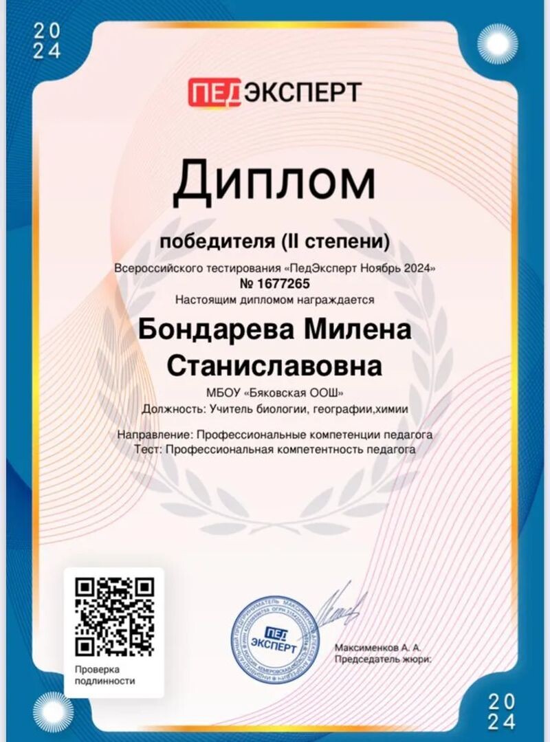- Всероссийского тестирования «ПедЭксперт», диплом победителя II степени, 2024 г.