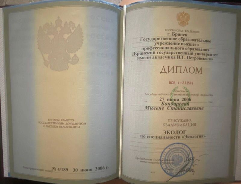 - БГУ им. академика И.Г. Петровского, эколог, 2006 г.