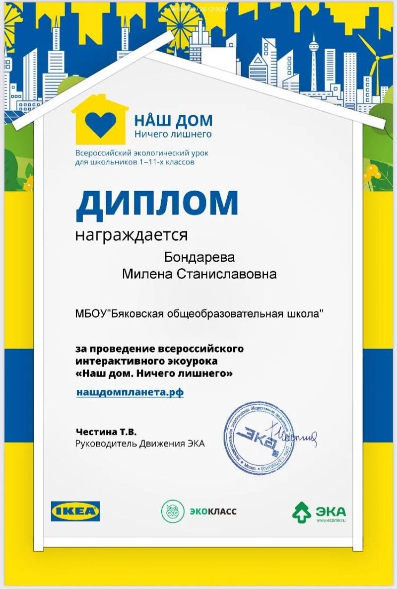 - ЭКА, диплом за проведение Всероссийского интерактивного экоурока «Наш дом. Ничего лишнего», 2023 г.