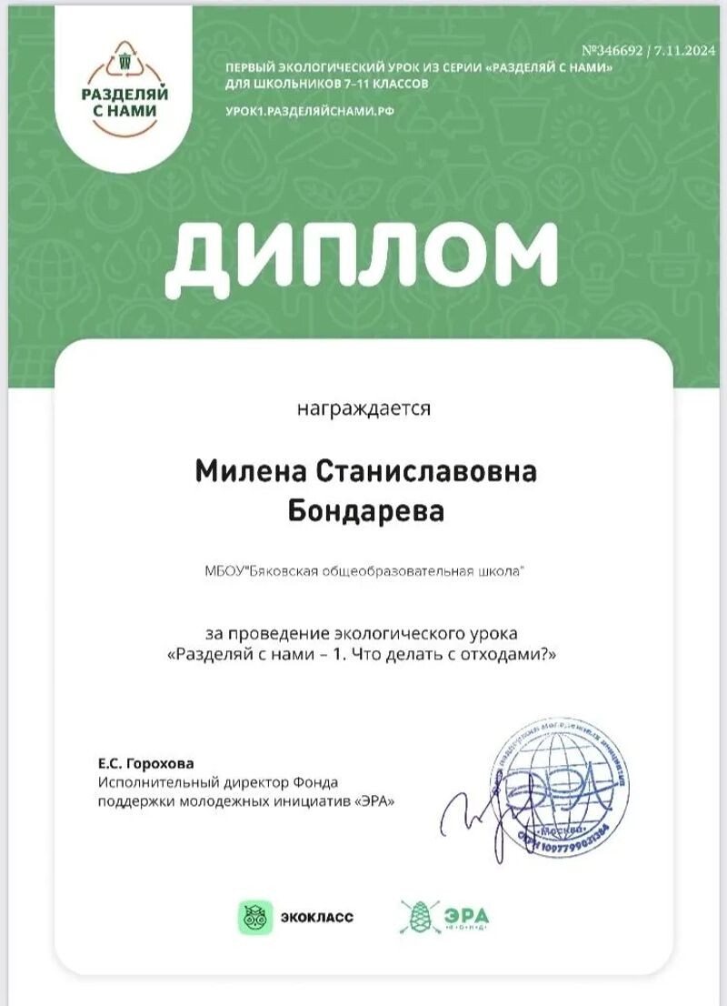- Фонд поддержки молодёжных инициатив «ЭРА», диплом за проведение экологического урока «Разделяй с нами — 1. Что делать с отходами?», 2024 г.