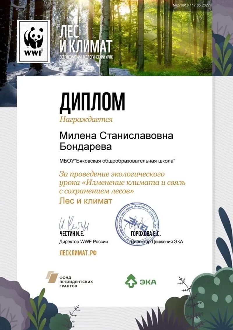 - ЭКА, Всероссийский экологический урок «Лес и климат», диплом за проведение экологического урока «Изменение климата и связь с сохранением лесов», 2023 г.