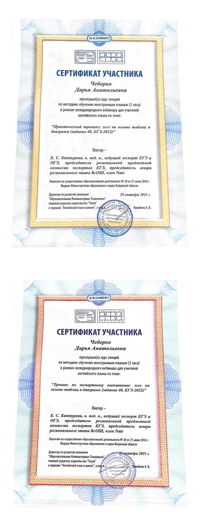 - ООО «Центр онлайн-обучения Нетология групп», программа «Практическая методика подготовки школьников к ЕГЭ по английскому языку и основы языкового тестирования», 2020 г.