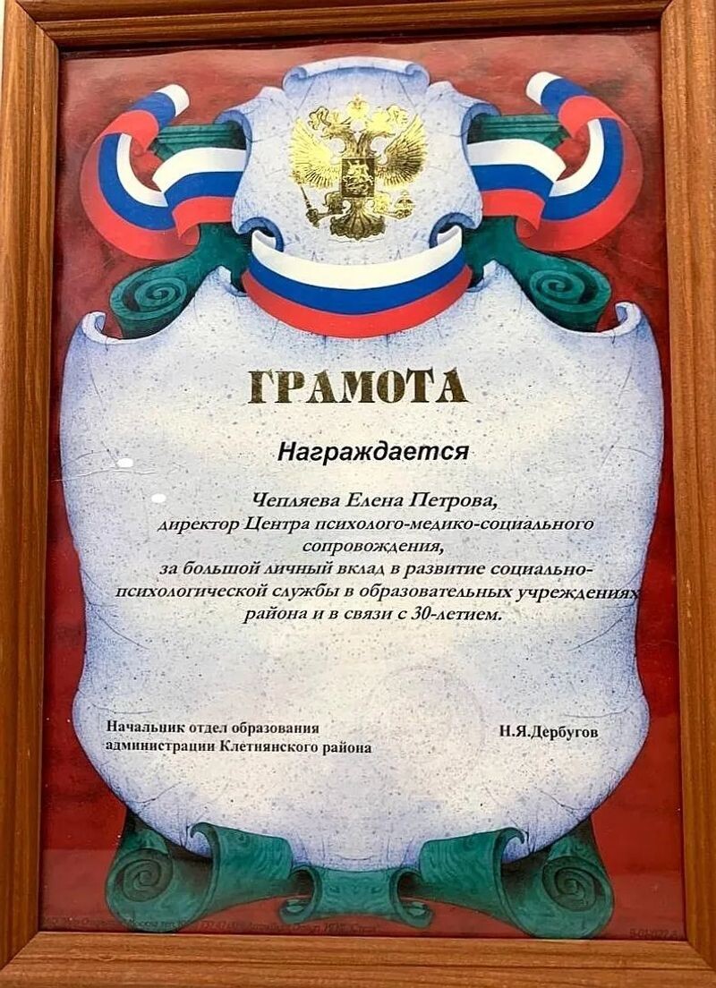 - Грамота Управления образования администрации Клетнянского района за большой личный вклад в развитие социально-психологической службы в образовательных учреждениях района и в связи с 30-летием, 2006 г.
