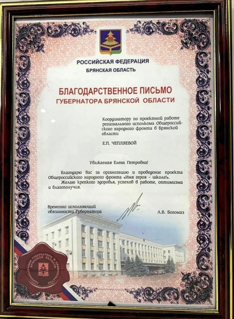- Губернатор Брянской области, благодарственное письмо за организацию и проведение проекта Общероссийского народного фронта «Имя героя школе!», 2017 г.