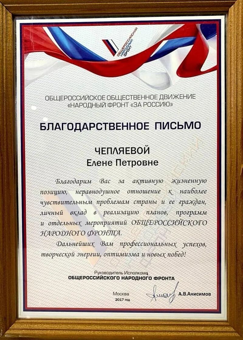 - Народный фронт «За Россию», благодарственное письмо за активную жизненную позицию, неравнодушное отношение к наиболее чувствительным проблемам страны и ее граждан, личный вклад в реализацию планов, программ и отдельных мероприятий, 2017 г.