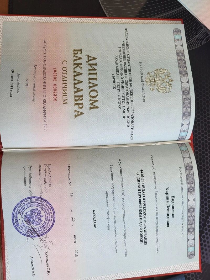- Диплом бакалавра с отличием. БГУ им.И.Г.Петровского. 44.03.05 педагогическое образование с двумя профилями подготовки (с 2013 г.).